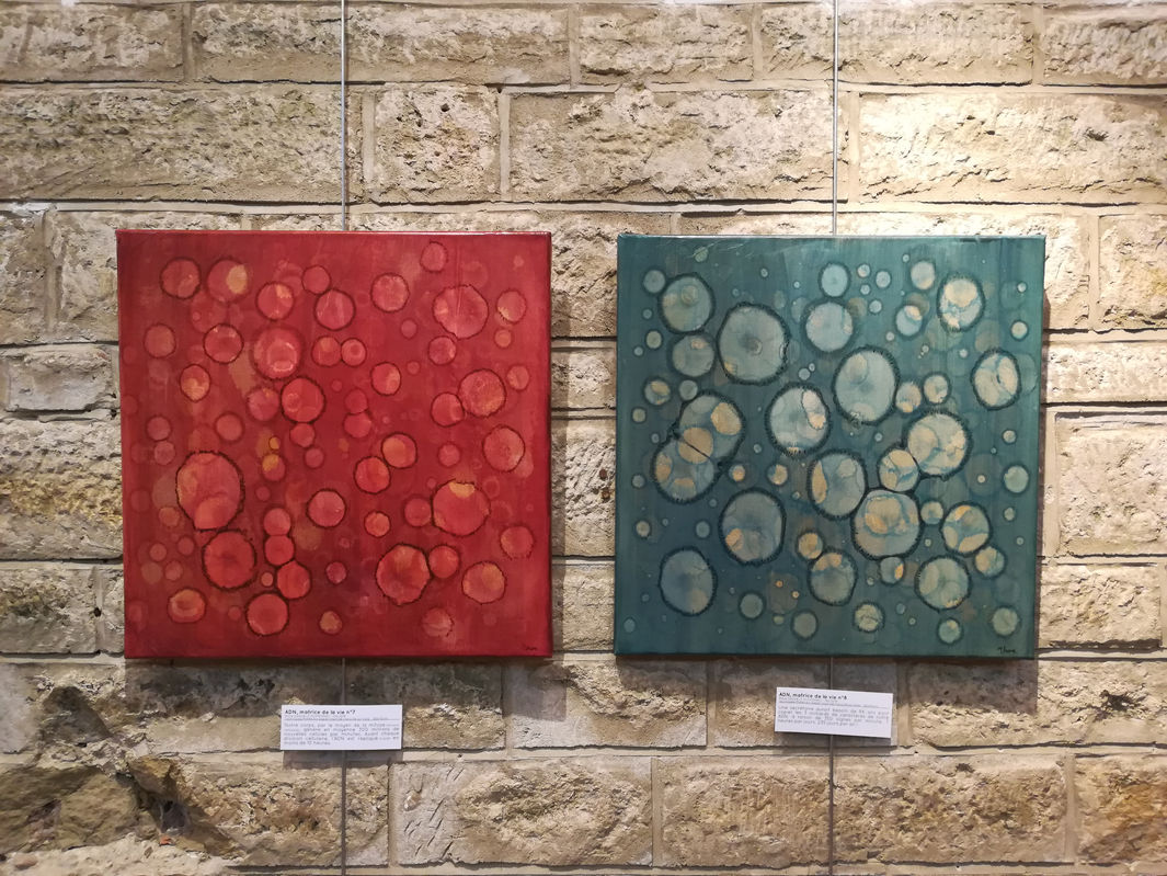 En filigrane, derrière la peinture & techniques mixtes, se trouvent une MATRICE TEXTUELLE composée d'un extrait d'ADN humain.